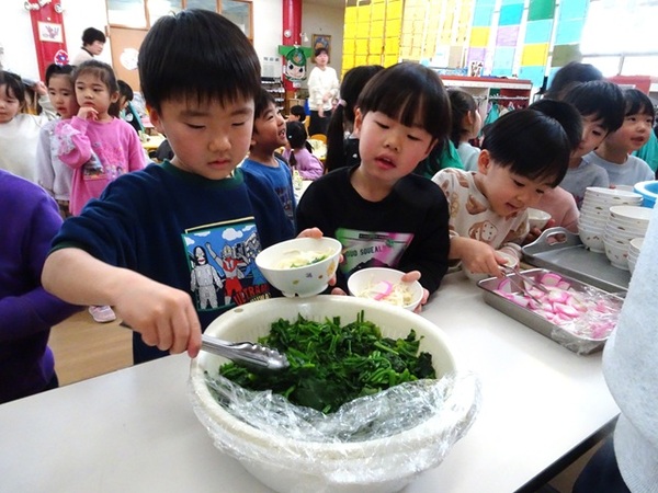 | 今日は1月のおたんじょう会です!そして、初☆うどんバイキングの日! トッピングは自分でよそうことにしてみました。みんな上手にトングを使えていましたね。意外にもほうれん草をたくさん食べてくれました♪スープは、おだしとカレースープの2種類。おかわりもたくさんしてくれましたね。お給食の先生、ごちそうさまでした。 おたんじょうび、おめでとうございます! |