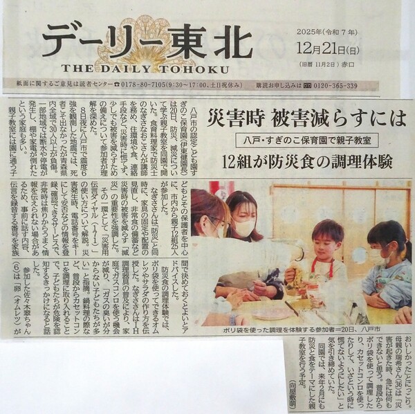 20日(土)防災料理教室を開催しました。講師に食育料理家・防災士のなぎさなおこ様、そして八戸市の危機管理部災害対策課から見付様をお招きして、防災、減災、避難所で使う防災用品について学ばせていただきました。 以前から企画していたのですが、12月8日に実際に八戸市で震度6強の地震が起きたので、日頃の備えと知識がいかに大切かと感じ、皆さん真剣に聞いておりました。 いざというときに慌てないように、防災用品の組み立てや「災害用伝言ダイヤル171」を実際に体験しました。