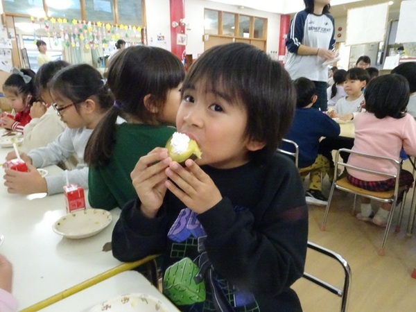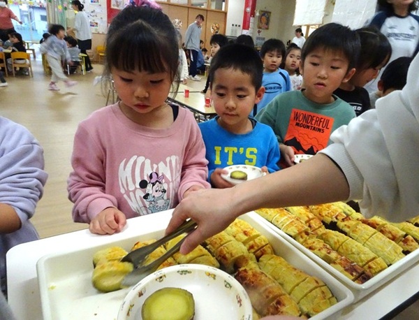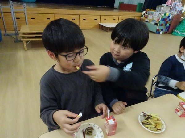 | 楽しみにいていた「いもやき会」。朝から天気を心配していましたが、そろそろ始めようかという頃に雨が降ってきてしまい、たき火はできませんでした。残念でしたね、、、。でもでも!おいしいおやつはできていました☆さつまいもおやつのバイキング♪好きなものを好きなだけいただきました♡ お給食の先生、今回もおいしくいただきました!ごちそうさまでした! |
